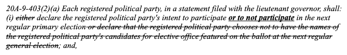 20A-9-403(2)(a) Each registered political party, in a statement filed with the lieutenant governor, shall: (i) either declare the registered political party's intent to participate in the next regular primary election or declare that the registered political party chooses not to have the names of the registered political party's candidates for elective office featured on the ballot at the next regular general election; and,